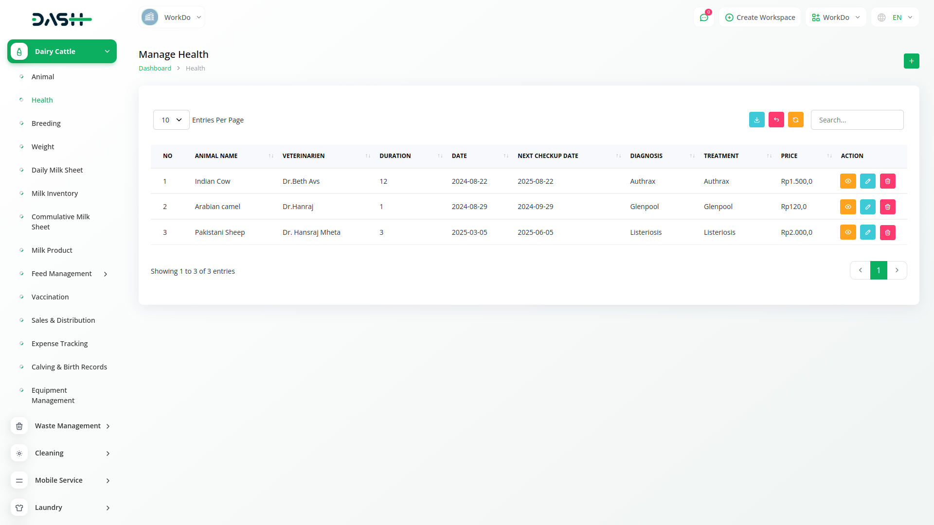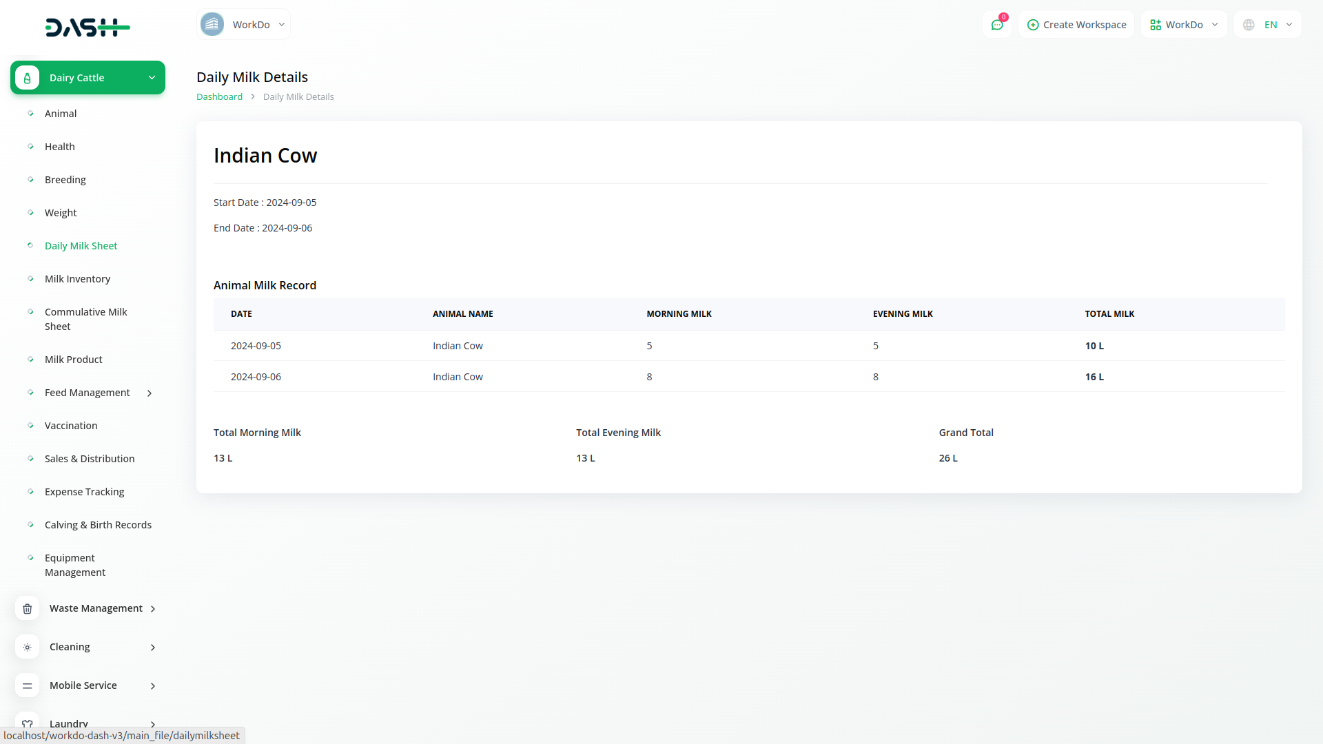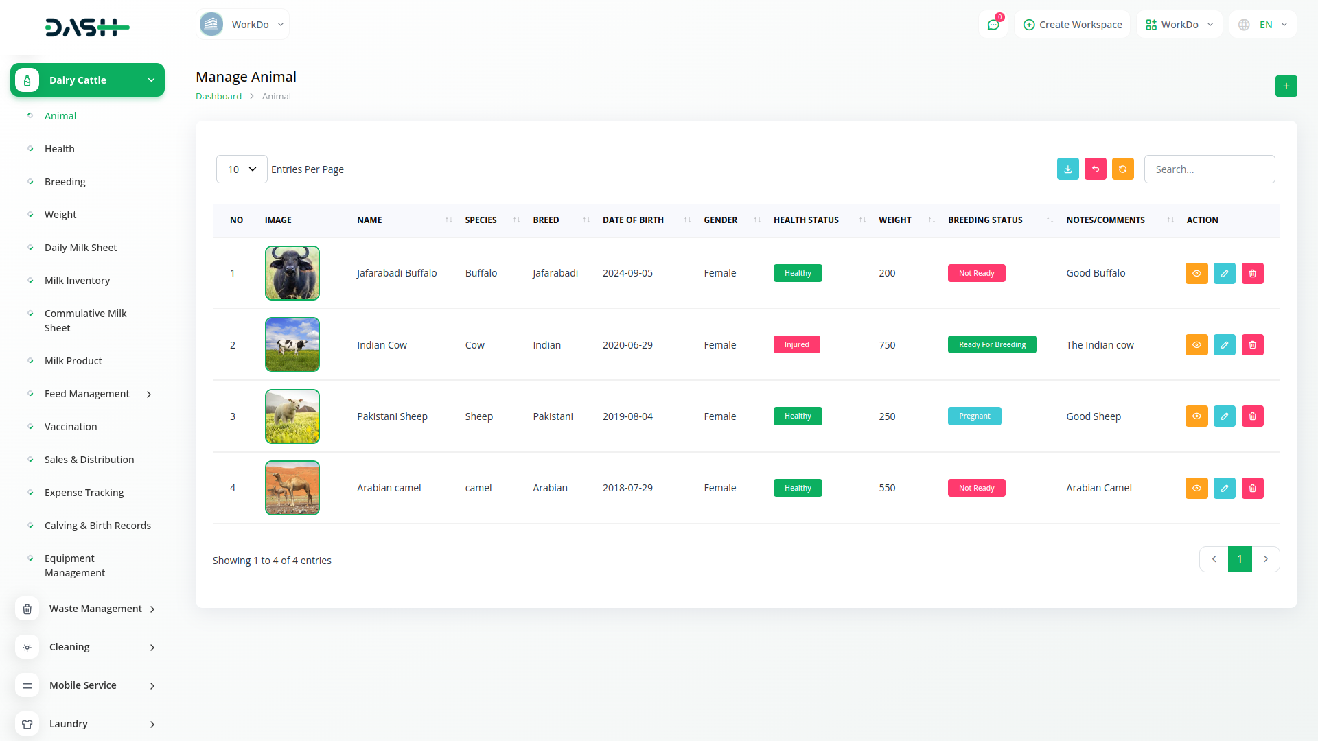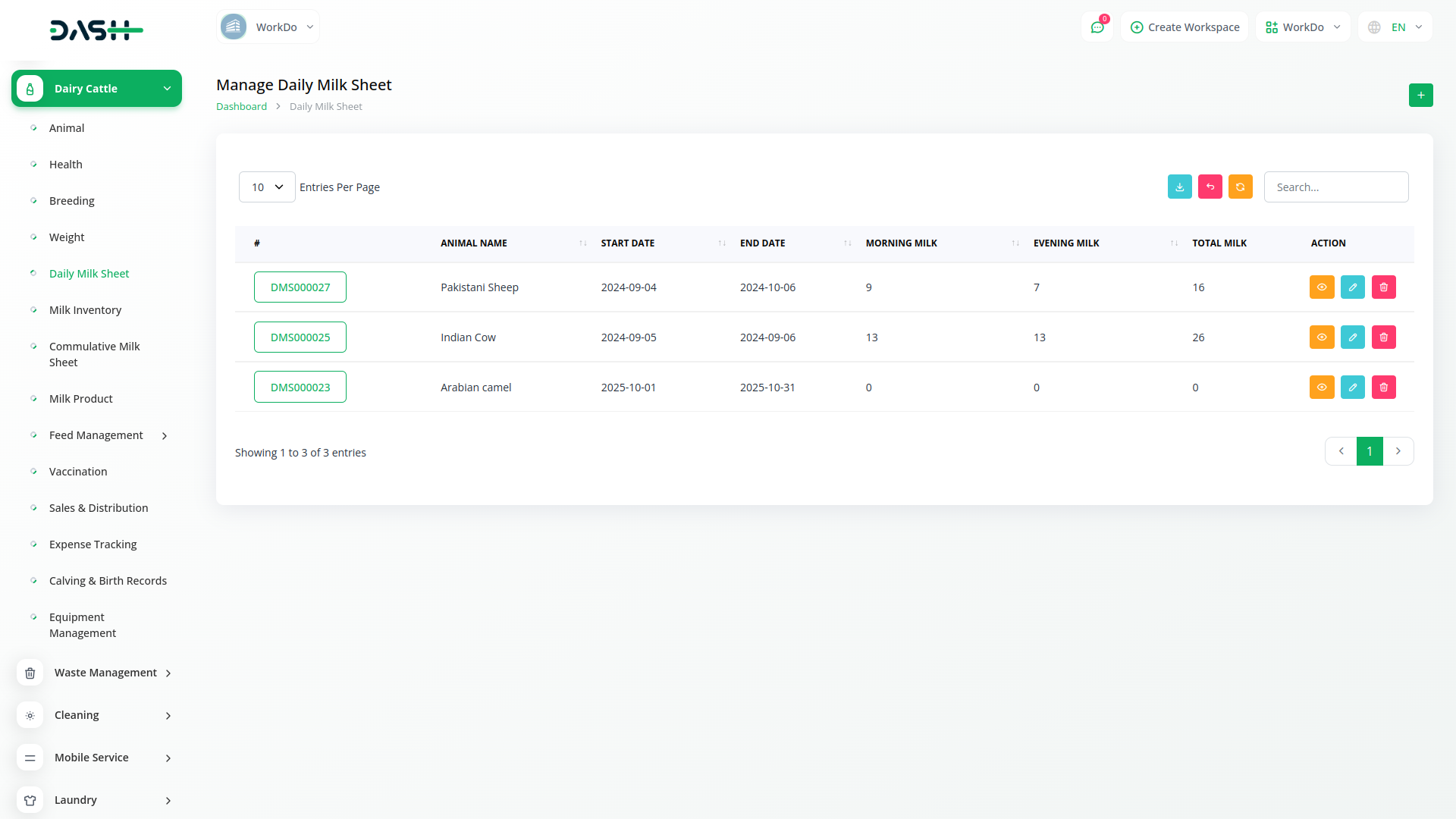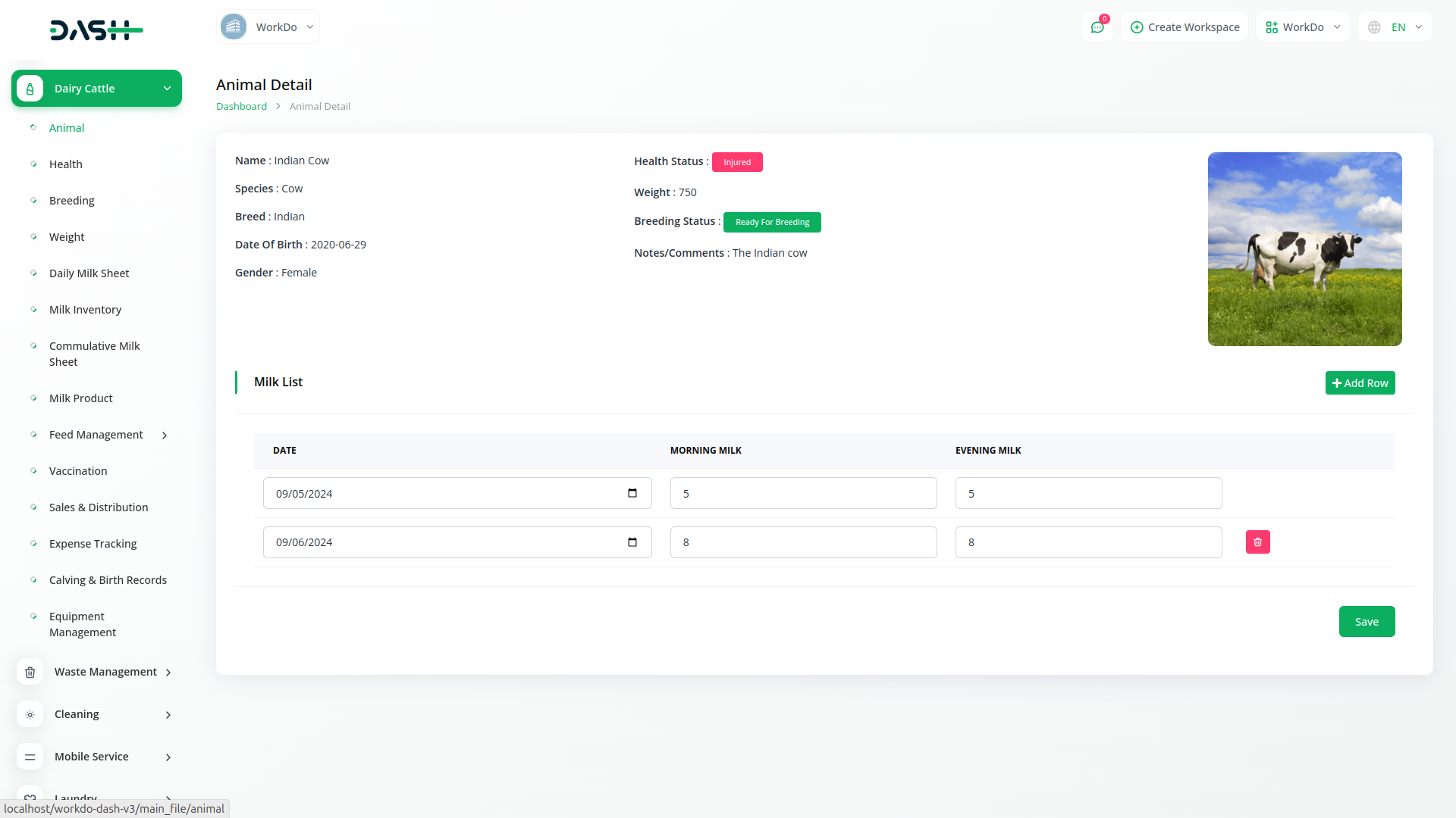 Dairy and Cattle Management module is your comprehensive solution for dairy cattle management. Our platform is designed to simplify the complexities of managing a dairy farm, offering seamless integration for tasks such as animal health monitoring, breeding management, weight tracking, daily milk yield recording, and milk inventory management. With Dash SaaS, you can efficiently oversee all aspects of your operation, ensuring the well-being of your herd while maximizing productivity.