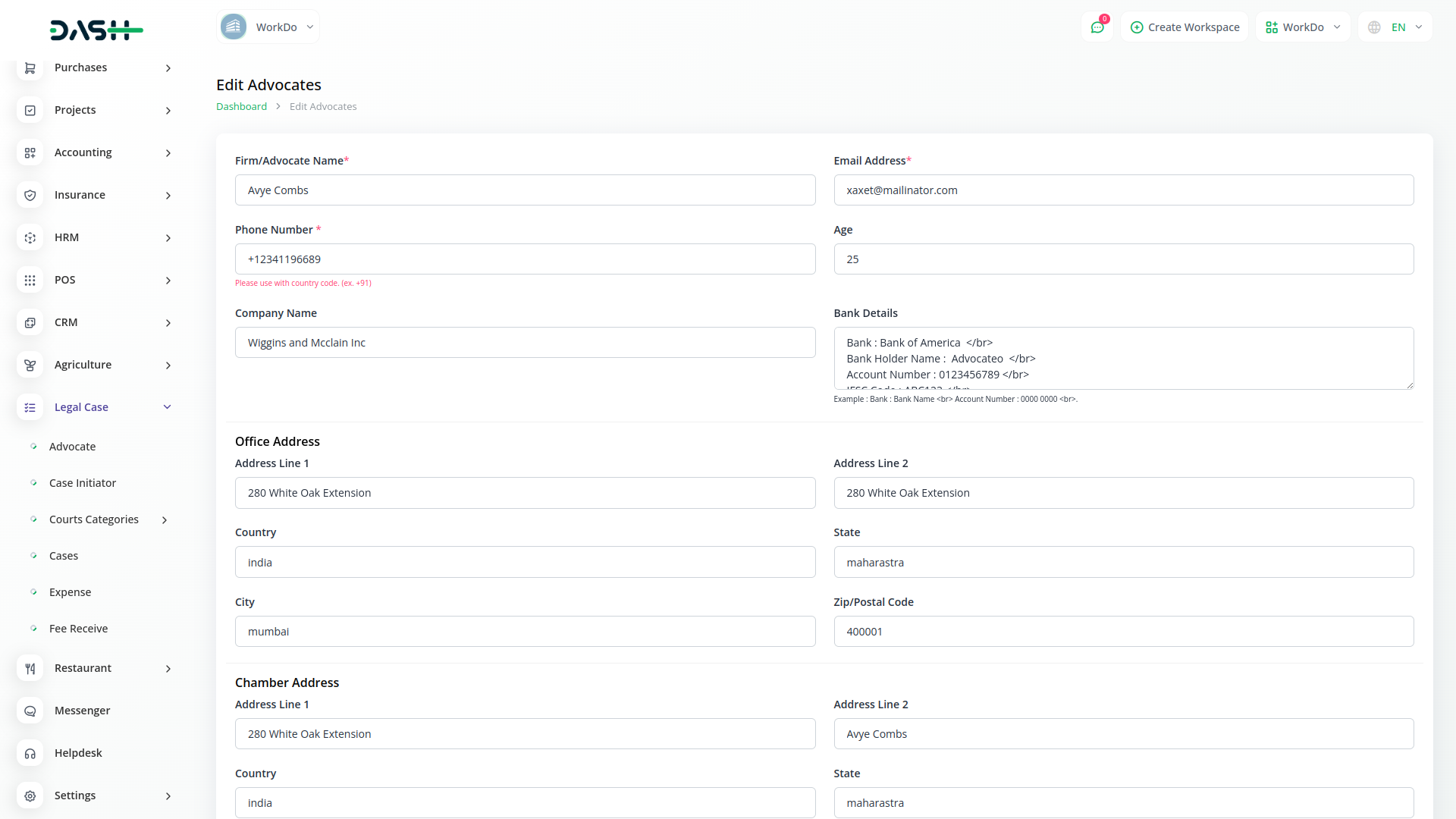 Explore the efficiency of the Dash SaaS Legal Case Management Hub, a dedicated tool designed for streamlined management of advocates, case initiators, and legal proceedings.With a user-friendly interface, this module simplifies advocate details, offering actions like editing information, resetting passwords, and deleting records. Gain insights into case details, client hearings, bills, and fees for efficient case initiator management.
