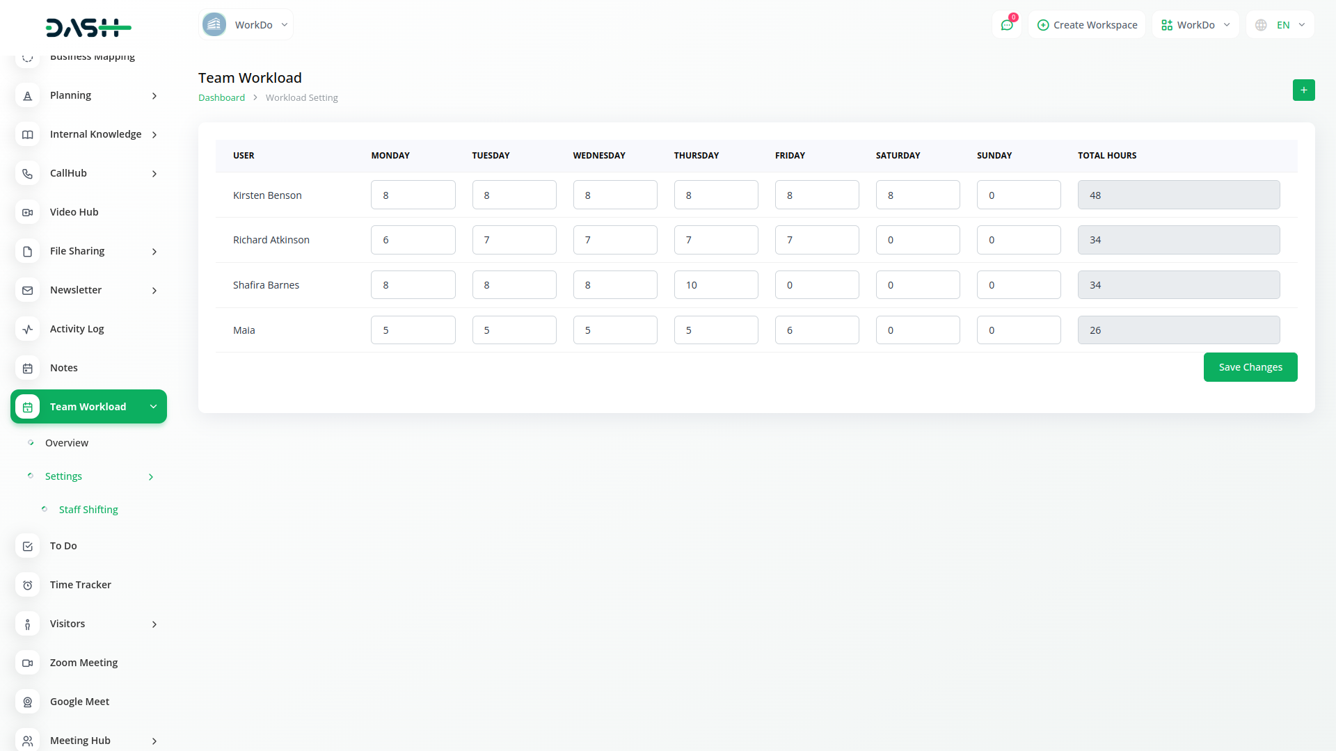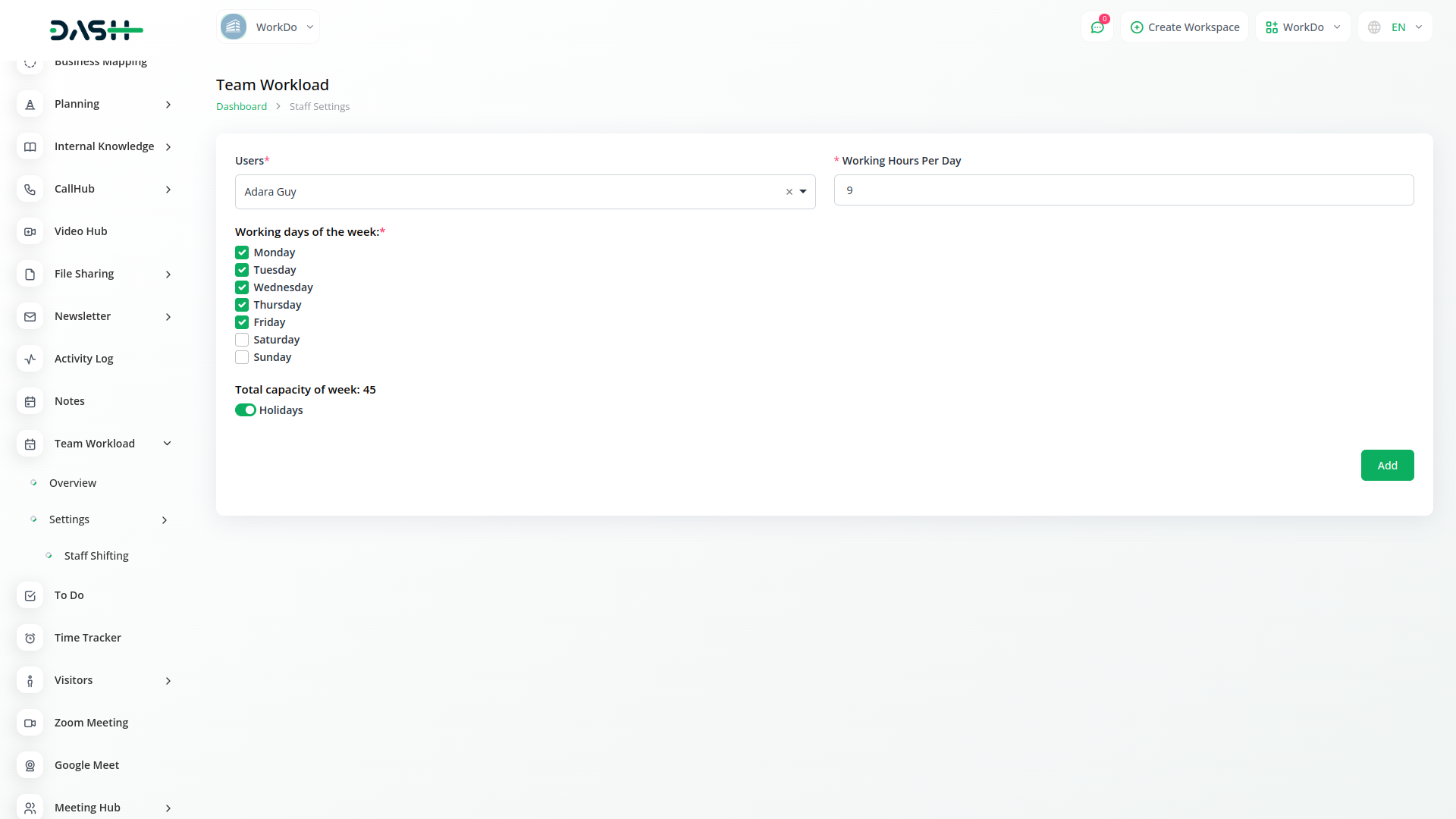 With the Team Workload module, we can find out the total number of hours an employee has the ability to work in a week and the total number of hours worked in these occupations.